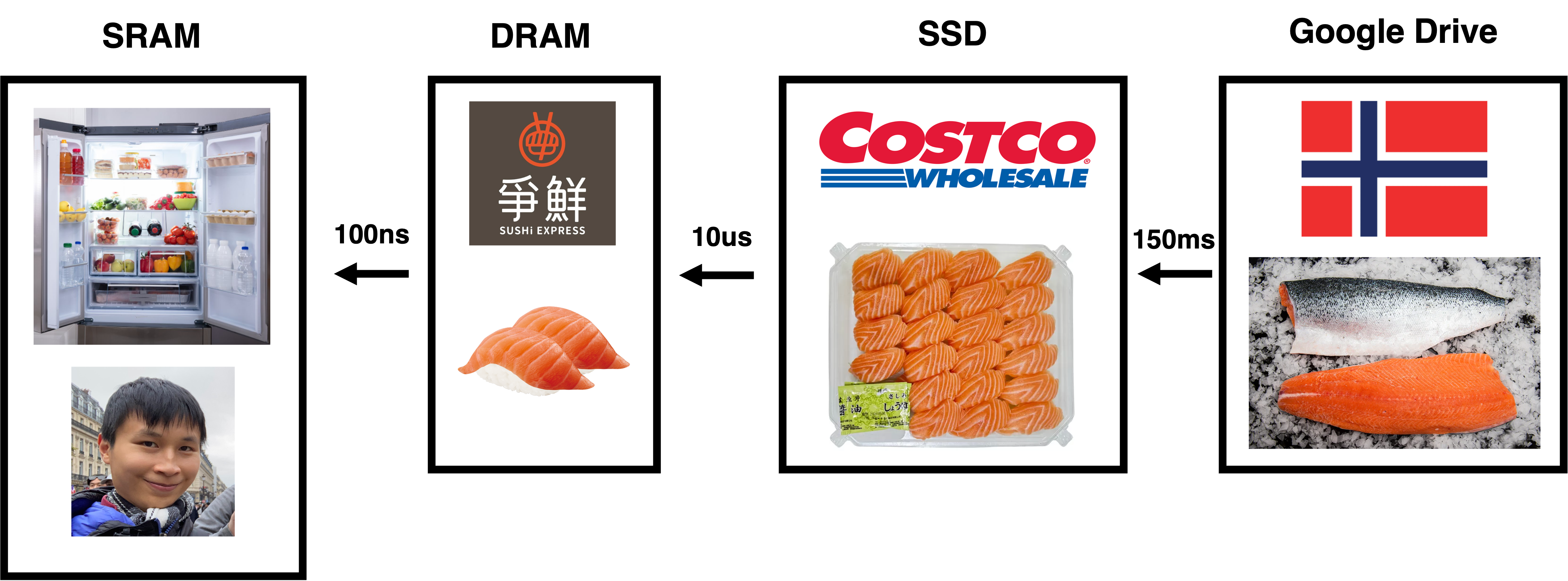 Think about how you get sushi for dinner. You first check your refrigerator (SRAM). If your fridge is empty, you call Uber Eat to get from 爭鮮 (Sushi Express) (DRAM). 爭鮮 might buy a large amount of salmon from Costco (SSD). Costco might get their salmon from Norway (very far away … Google Drive!?), which takes a very long time.
