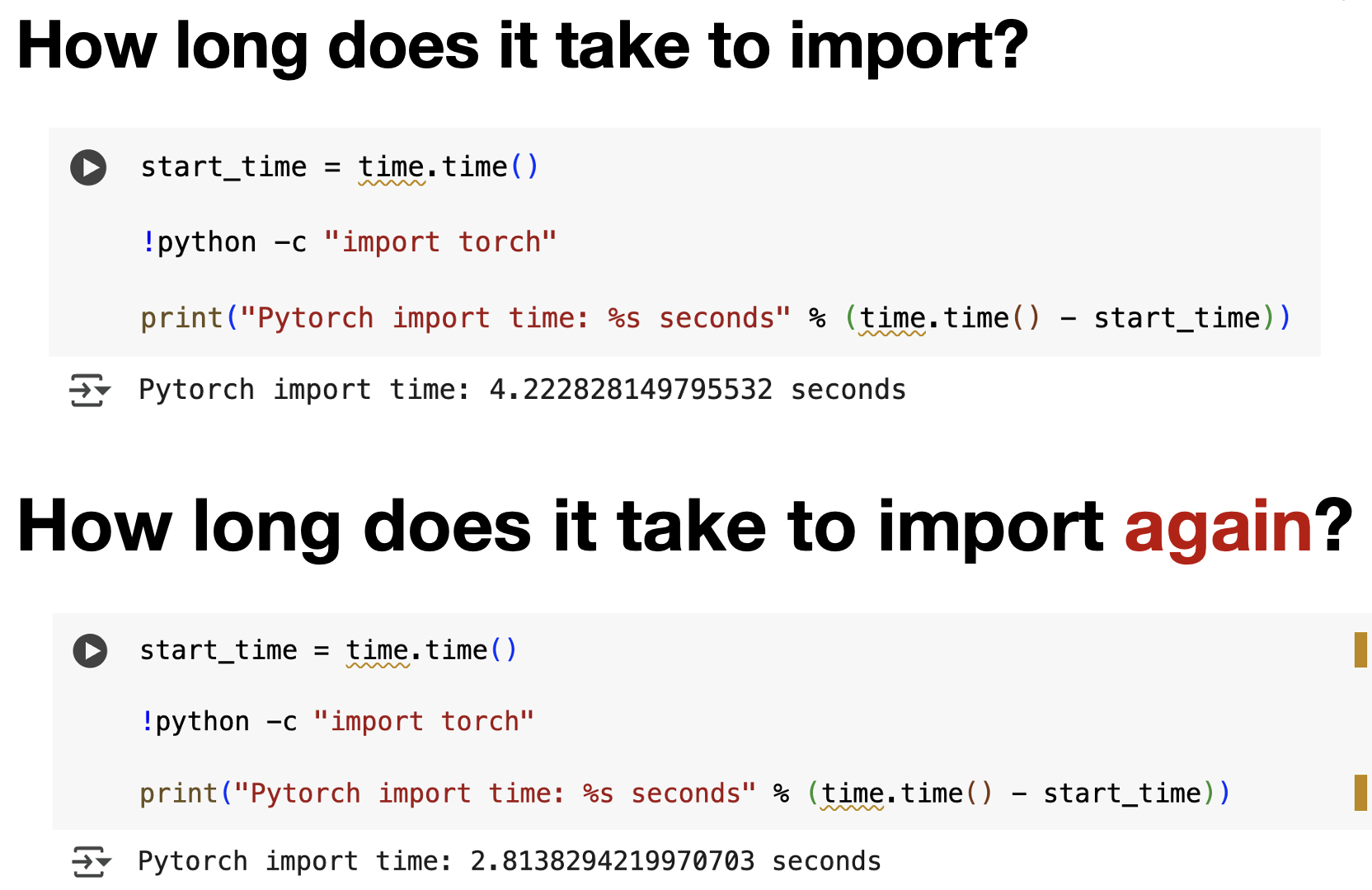 Send packet CA->Netherlands->CA 4.8 years Average time it takes to complete a bachelor's degreeIn the first two weeks, we discussed how dynamic libraries solve two related problems: disk space and loading time. When you use TensorFlow on Google Colab, the first time you import it, the system loads the massive library from disk into memory. This takes several seconds. But if you restart your notebook and import TensorFlow again, it loads much faster. Why? Because the OS has cached the library in memory.
