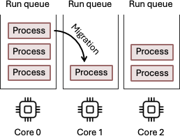 , so the kernel context switches to Process B to run on Core 0. Process A is now waiting in the runqueue, but no one is currently running on Core 1. Should the scheduler resume process A on CPU Core 1? This is known as task migration. Migrating to Core 1 would incur a significant performance penalty from cache misses, because all of process A’s data would need to be reloaded from slow main memory. Therefore, the scheduler will often prefer to let process A wait a little longer to resume on Core 0, where its data is still “hot” in the cache, because the performance benefit from more cache hits could be greater than the performance benefit of starting a few microseconds earlier on a different core.CPU Affinity