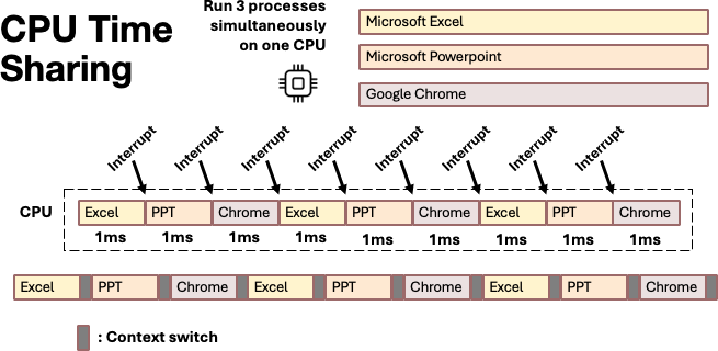 When we discussed interrupts in Worksheet 3, we learned that they allow your computer to run multiple applications at the same time on a single CPU. When you have Excel, PowerPoint, and Chrome running at the same time on your laptop, the CPU is actually switching rapidly between these three programs.