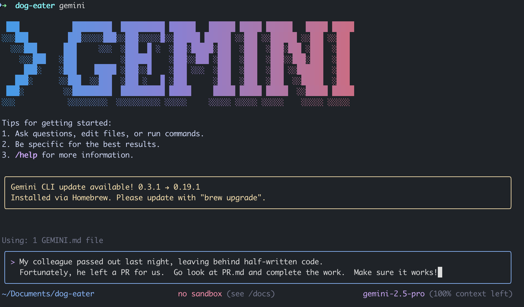 $ git push origin feature/doghouse-deadlock-preventiongit pull, check out the PR branch. He continues to open Gemini Code and types: